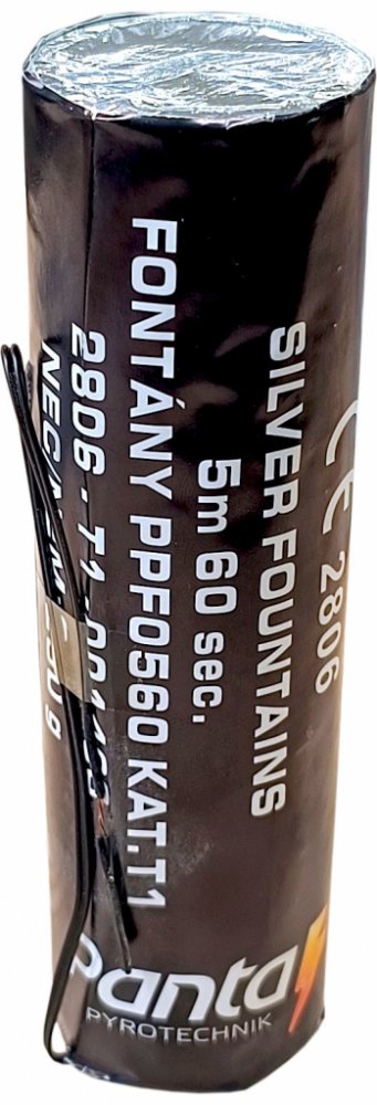 Pyrotechnika pódiová fontána Silver 5m - elektrický palníkFontánu ve tvaru válce postavíme na pevnou podložku.Během tří až šesti vteřin po zapálení se objeví různé světelné efekty.Pozor, fontána se odpaluje pomocí odpalovacího zařízení, nelze odpálit zapálením (nemá zápalnici).Efekt: gejzír stříbrných hvězd až do výšky 5m - podiová pyrotechnika pro koncerty a kulturní akceDoba trvání efektu: 60 sTřída nebezpečí: Kategorie T1ADR zařazení: 1.4GBezpečnostní pokyny: podložka pod fontánou musí být nehořlavá a pevná. Fontánu postavte tak, aby se nepřevrhla. Po zapálení fontány ihned odstupte alespoň o 5 metrů. Zápalnici nikdy nezapalujte tak, aby jakákoli část vašeho těla byla nad výmetnou částí fontány.