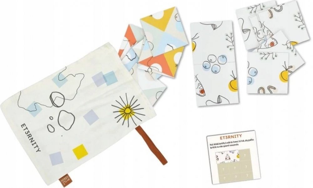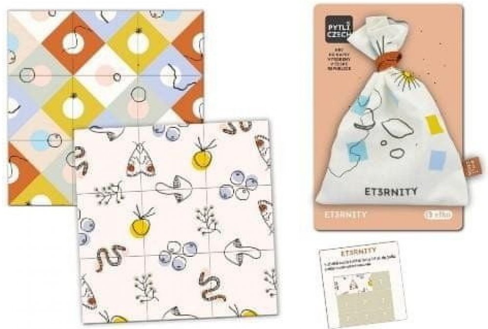 Složit z devíti kartiček čtverec tak, aby v něm obrázky na sebe správně navazovaly, lze zabrat víc, než si myslíte. Zdánlivě lehký hlavolam v praktickém textilním designovém sáčku zažene nudu doma, na výletech i na párty. Vyrobeno v České republice. Představte si, že máte v ruce devět kartiček, které vám mohou přinést řádnou porci zábavy. Vaším úkolem je poskládat je do čtverce tak, aby na sebe obrázky dokonale navazovaly. Zní to jednoduše, že? Ale opak je pravdou! Tato sada dvou originálních hlavolamů v praktickém bavlněném sáčku vás bude provázet doma, na výletech a třeba i na párty. Už nikdy nebudete muset řešit nudu, protože tento malý kamarád vám bude dělat společnost kdekoli, například i při odpočinku uprostřed ferraty. V sáčku jsou hlavolamy hned dva, takže můžete soutěžit, kdo složí „své Eternity“ rychleji. Jak sundat hlavolam ETERNITY? Vyberte 9 kartiček se stejnou rubovou stranou. Kartičky otočte lícem nahoru. Úkolem je složit z těchto kartiček čtverec 3x3 a to tak, aby grafika jednotlivých sousedících kartiček na sebe dokonale navazovala. Kartičky lze k sobě přikládat různými způsoby, nicméně hlavolam má pouze jediné řešení, jak správně složit čtverec. NÁŠ TIP - S Eternity můžete soutěžit: Každý hráč si vezme jednu sadu kartiček a snaží se hlavolam sundat rychleji než soupeř. Pokud hraje více osob, zapisují si výsledný čas celkového skládání a vyhrává hráč s nejkratším naměřeným časem. Hlavolamy jsou vytvořeny z kreseb designérky a cestovatelky Táni Sekerkové. Její ilustrace přemění každý pokus o složení hlavolamu na vizuální potěšení. … jaké kouzlo se skrývá za Táninou islandskou ilustrací? Dnes večer jsme přešli na sever do oblasti kolem jezera Mývatn. Na obloze byly mraky, které vypadaly jako ušlehané ze šlehačky. Do toho začalo zapadat slunce a já bych si ten okamžik nejraději nakreslila. Bohužel jsem s sebou neměla barvy. Island je nejmagičtějším místem, na kterém jsem kdy byla. Teď už nám jen chybí vidět ty troly, které v noci chybí do údolí… Obsahuje: designový bavlněný sáček s praktickou gumičkou na uzavírání 2 hlavolamy - 2x 9 pevných kartonových kartiček 58x58 mm návod
