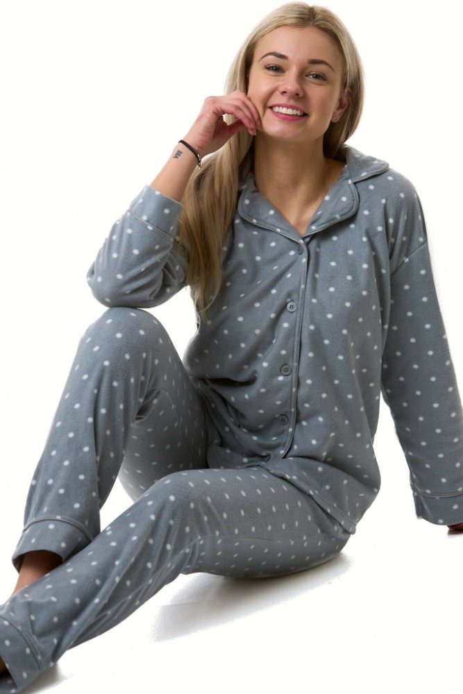 Dámské pohodlné pyžamo z měkkého, hebkého, teplého a hřejivého flísového materiálu. Kabátek na knoflíky s límečkem, dlouhý rukáv a dlouhá nohavice. Šedý podklad zdobí bílé puntíky.