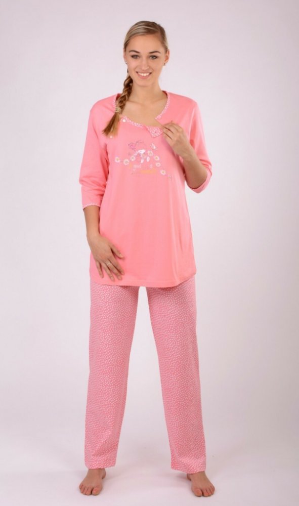 Mateřské pyžamo - pohodlné prodloužené tričko, s tříčtvrtečním rukávem, je na přední straně s obrázkem - medvídek s kvítky a nápis: A Good Life is a Happy Moments. Oboustranné rozepínání, pro pohodlné kojení. Dlouhé kalhoty, se srdíčkovým vzorem, mají v pase gumu, i šňůrku ke ztažení.