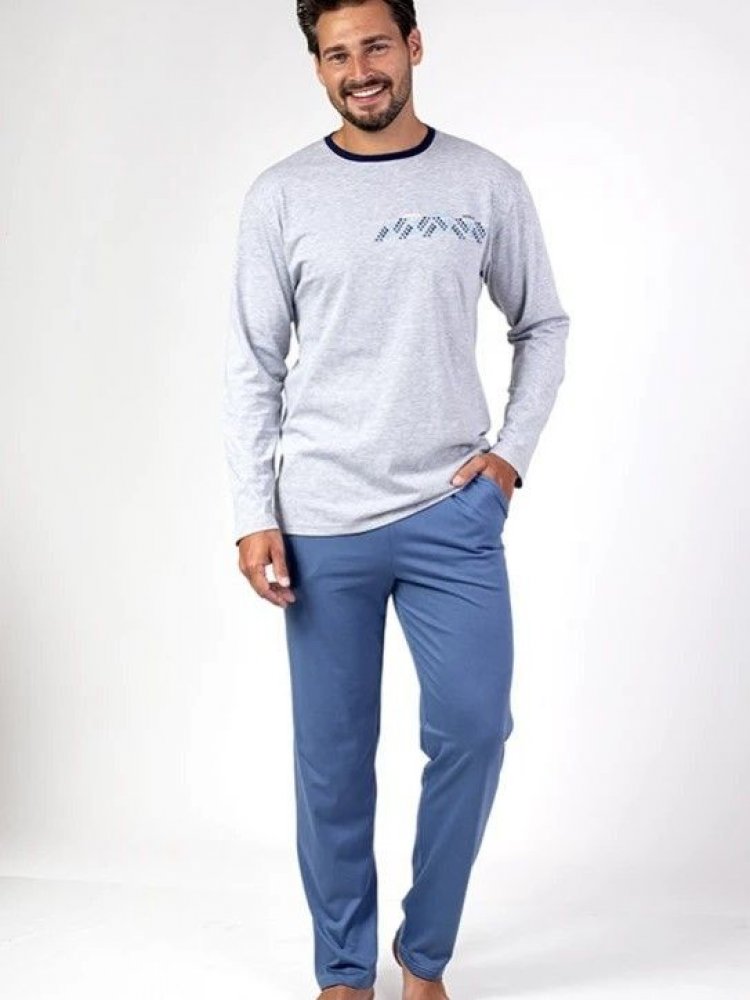 BARVA: modrá MATERIÁL: 100% bavlna Pánské pyžamo se skládá z trička s dlouhými rukávy v šedé barvě, které je na levé straně hrudi zvýrazněno jemným potiskem s puntíky. Tričko má klasický kulatý výstřih a je vyrobeno z prvotřídní, příjemné tkaniny, která poskytuje pohodlí během nošení a zároveň zajišťuje dostatečnou prodyšnost. Kalhoty jsou volného střihu a jsou vyrobeny v tmavě modré barvě. V pase...