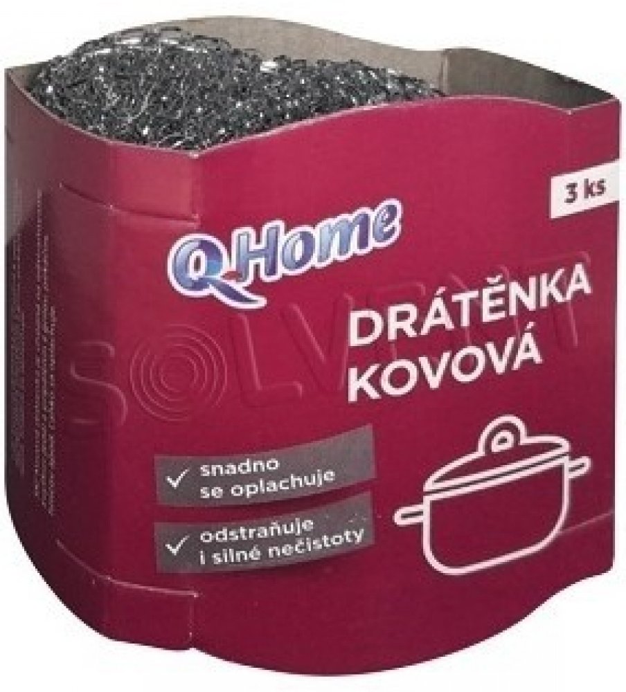 Kovová drátěnka od značky Q-Home. Výhodné balení obsahuje: 3x drátěnka. Pro důkladné čištění i silně zašpiněného nádobí, roštů aj. Pro důkladné vydrhnutí hrnců a pánví. Odstraní odolné, zaschlé, spálené a připečené nečistoty. Drátěnka je omyvatelná. Papírový obal je recyklovatelný.