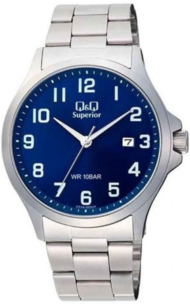 Q&Q analogové ocel ocel 100 m bateriové minerální sportovní pánské bez osazení Superior kulaté stříbrná modrá sklapovací přezka pro potápění (100+ m) na ruku s arabskými číslicemi stříbrná ocel pevná ocel