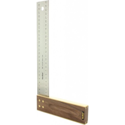 Úhelník s extra 45 mm šiřokým nerezovým pravítkem. Držák z ořechového dřeva. Oboustranně vyleptaná milimetrová stupnice. Přesnost stupnice: 0,005mm/1cm. Přesnost pravého...