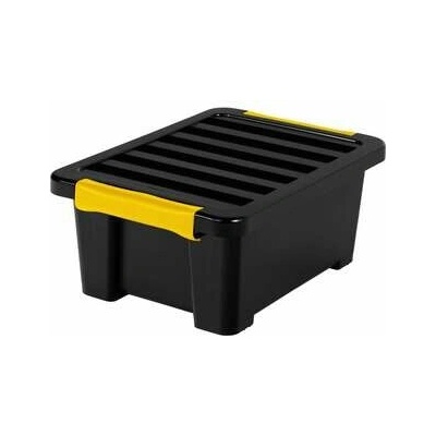 Úložný plastový box DIY EASY s víkem. Objem 11L. Moderní design a kvalitní provedení od švýcarské značky Rotho. Lesklá černá barva. Víko je opatřeno žlutými postranními úchyty...