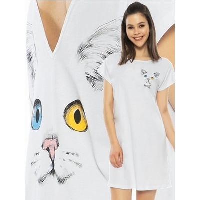 Dámská noční košile, s krátkým rukávem, kde hlavním motivem jsou velké různobarevné oči kočky. Košile je zajímavě řešená i svým střihem - na zádech s hlubokým véčkovým výstřihem...