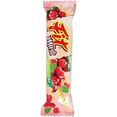 Fit Musli kanadská brusinka tyčinka 30g Tyčinka plná energie, ovoce a oříšků Složení: škrobový sirup, OVESNÉ vločky, brusinky 10,5% (cukr, brusinky, kyselina: k. citronová, bezinkový extrakt, slunečnicový olej), extrudovaná kukuřice, papája (papája, cukr, kyselina:...