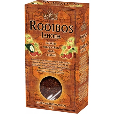 Rooibos čaj Jahoda sypaný 70 g - Grešík Lahodný nápoj s chutí medu a jahod Rooibos je čaj z fermentovaných lístků rostliny Asphalatus linearis původem z Jižní Afriky....