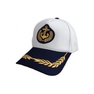 Modro-bílá kapitánská čepice se zlatým páskem, černým kšiltem a kotvičkou, nastavitelná velikost, vzadu na suchý zip. Materiál: 89% polyester, 10% polyurethane, 1% polystyrene...