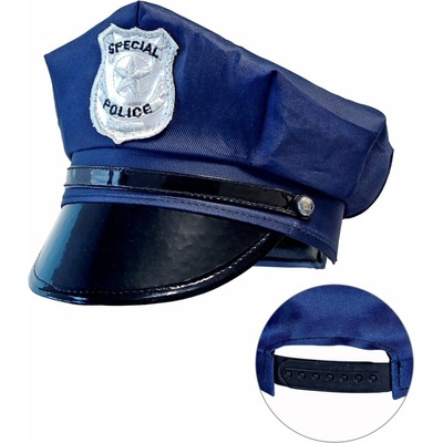 Policejní čepice, nastavitelná s policejním znakem. Obvod hlavy: univerzální velikost Materiál: 77% polyester, 20% polyurethane, 3% železo