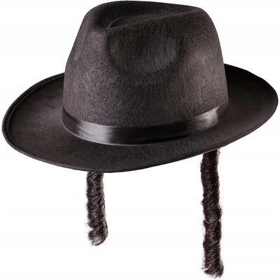Plstěný židovský klobouk s pejzy, vhodný ke kostýmu rabína. Materiál: 100% polyester Obvod hlavy: 58cm