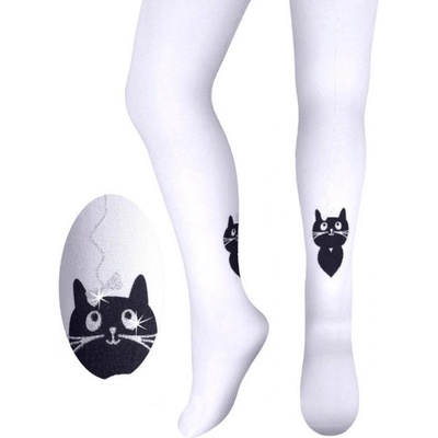Matné neprůhledné punčochové kalhoty pro slečny, z měkkého příjemného materiálu, nemají zpevněný sed, patu ani špici. Na obou nohách je obrázek černého kocoura zdobený...