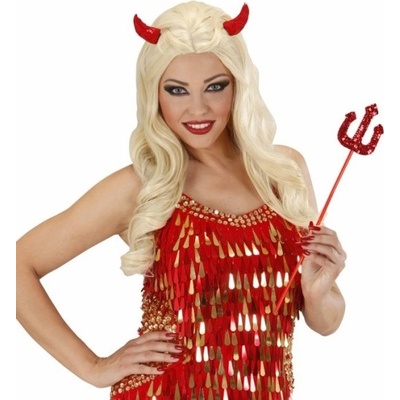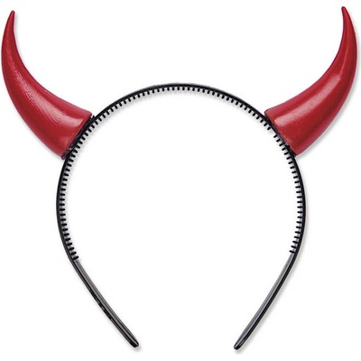 Červené rohy pro čerta, připevněné na čelence.