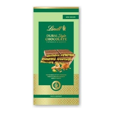 Lindt Čokoláda Dubai Style 145g Mléčná čokoláda plněná pistáciovou náplní s kadayif (26 %) Složení: Mléčná čokoláda [cukr, kakaové máslo, sušené MLÉKO, kakaová hmota*, MLÉČNÝ...