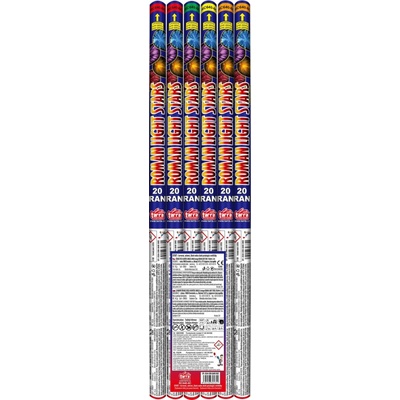 6ks římských svící 20ran, 4 druhy efektů, 2. kategorie, PRODEJ OD 18 LET, délka: 60cm. Cena je za 6ks.