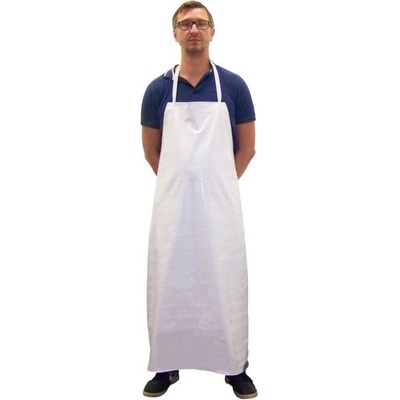 Bílá zástěra s náprsenkou, v pase na zavázání tkanicí.Vhodná do potravinářství.