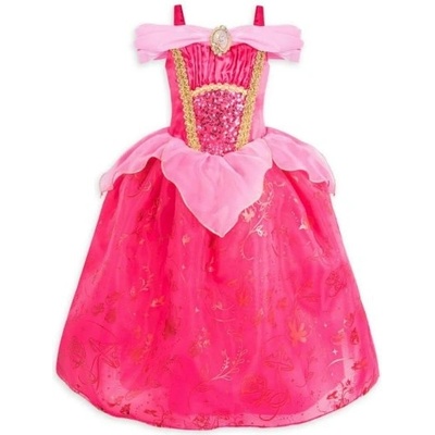 7-8 let kostým Šípková Růženka saténové růžové šaty Má tenká malinová ramínka se světle růžovou látkou přehozenou přes každé rameno Na hrudi je brož s duhově růžovým...