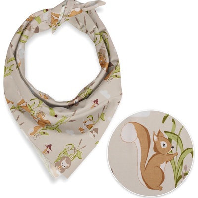 Dětský bavlněný šátek s milým dětským motivem veverek, ježků a jezevců na světle béžovém podkladu. Je ušitý z kvalitního hustě tkaného 100% bavlněného plátna s certifikátem...