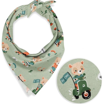 Dětský bavlněný šátek s milým dětským motivem méďů na motorkách a skateboardech na zeleném podkladu. Je ušitý z kvalitního hustě tkaného 100% bavlněného plátna s certifikátem...
