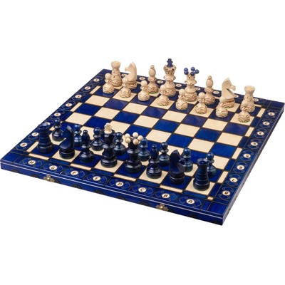 Oblíbené dřevěné šachy v modré barvě. Dekorativní šachovnice i figurky, velikost 54 x 54 cm, výška krále 11 cm, skládací šachovnie s úložným prostorem a organizérem pro figurky. Vhodné jako dekorace i pro hru.