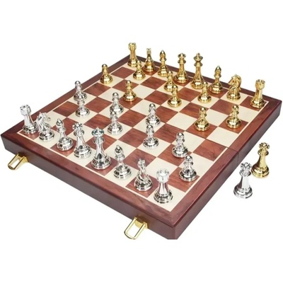 Prémiové šachy s hrací plochou vyrobenou z přírodního dřeva a s pozlacenými nožkami v rozích šachovnice. Figurky mají na spodní části samet, aby se s nimi dobře posouvalo po hrací ploše a lze je uložit do polstrování v prostoru pod hrací plochou šachovnice.