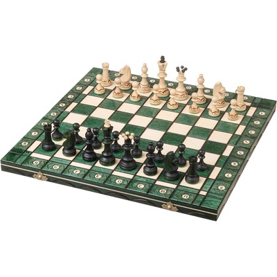 Dřevěné šachy s dekorativními prvky v zeleném provedení, velikost šachovnice 54 x 54 cm, výška krále 11 cm, skládací šachovnie s úložným prostorem a organizérem pro figurky. Oblíbená šachová souprava.