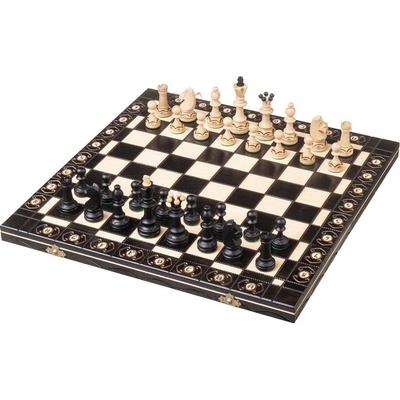 Dřevěné šachy s dekorativními prvky v černém provedení, velikost šachovnice 54 x 54 cm, výška krále 11 cm, skládací šachovnie s úložným prostorem a organizérem pro figurky. Oblíbená šachová souprava.