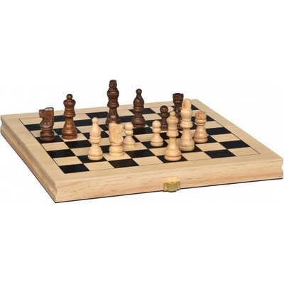Šachovnice slouží zároveň jako krabička. Vyrobeno ze dřeva. Rozměry desky: 28,5 x 28,5 cm, Výška krále: 6,5 cm. Návod je německy.