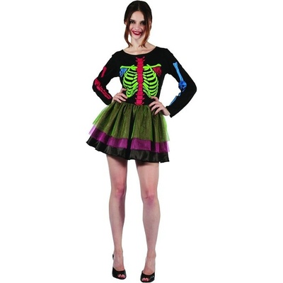 Dámský kostým šaty KOSTLIVEC v univerzální velikosti. Součástí kostýmu lidská kostra jsou šaty, zakončené zeleným, fialovým a černým řasením v několika vrstvách. Vrchní díl šatů má dlouhý rukáv a je zdobený neonovými aplikacemi znázorňující lidskou kostru. Karnevalové...