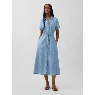 Dámské džínové košilové midi šaty z pevného denimu bez streče.Klasický košilový límec.Zapínání na knoflíky po celé délce.Krátké rukávy.Denimový pásek na zavázání v...