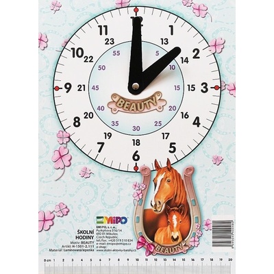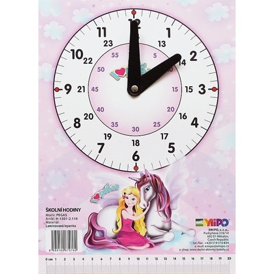 Školní hodiny slouží k výuce času prvňáčkům základních škol. Ve spodní části hodin je pravítko, které se může odstřihnout a používat samostatně.