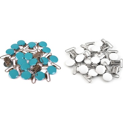 Kovový šlový závěs neboli klip zdobený barevným lakovaným kolečkem. Tento typ klipu obsahuje bílé plastové vložky na zoubcích, které díky tomu lépe drží než typy bez plastových...