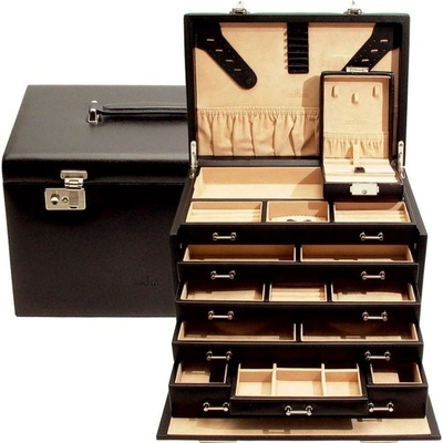Pětipatrová šperkovnice pro přehledné uložení šperků a hodinek, vyrobená ze dřeva potaženého kvalitní pravou kůží. Vnitřek šperkovnice je lemován italským sametem. Ve spodním...