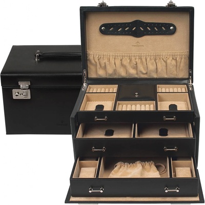 Třípatrová šperkovnice pro přehledné uložení šperků a hodinek, vyrobená ze dřeva potaženého kvalitní pravou kůží. Vnitřek šperkovnice je lemován italským sametem. Ve spodním...