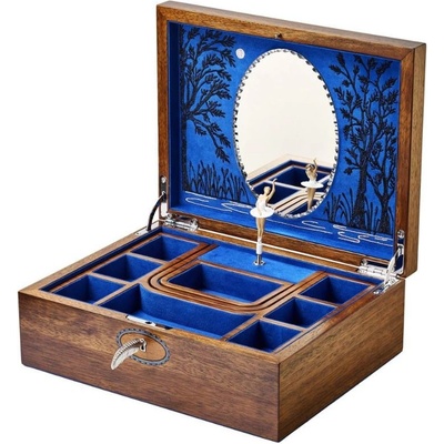 Šperkovnice Wolf Ida Ballet Musical Swan Lake 190106 hnědé barvy s modrým interiérem je vyrobena z ořechového dřeva a nádhernými intarziemi, doplněnými kováním se stříbrnou...