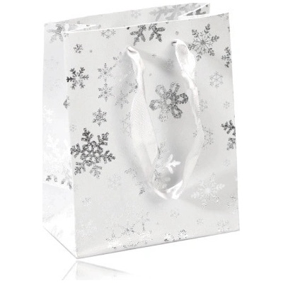 Papírová dárková taška v bílém barevném provedení s motivem vloček stříbrné barvy. Matný vroubkovaný povrch.
