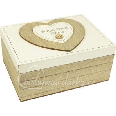 Střední dřevěná dárková krabička ve tvaru srdce ve stylu vintage s jednoduchým zaváráním. Na víčku je plastické dřevěné srdíčko s knoflíkem a s textem Home sweet home. Krabička...