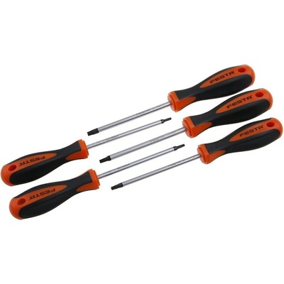Sada šroubováků TORX FESTA S2 5díl. materiál: molybdenová ocel S2, kalený hrot magnetický, chráněný tvrdochromem, výborné antiskluzové vlastnosti rukojeti a odolnost vůči mazadlům a chemikáliím zaručuje kombinace polypropylenu a pryže Sada šroubováků FESTA má kovový...