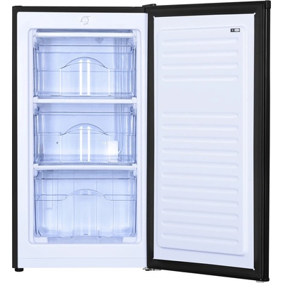 Volně stojící šuplíkový mrazák o objemu 64 l *. Energetická třída D se spotřebou 126 kWh/rok. Černá barva. Kompaktní rozměry s výškou do 85 cm. Panty dveří lze přehodit.