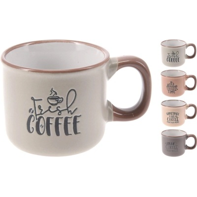 MUG, STONEWARE, 90ML/3.04 OZ, SIZE: DIA: 62XH53MM, WEIGHT: 110 GRAM. 4 ASSORTED COFFEE DESIGNS EACH OWN BACKGROUND COLOUR. WITH BROWN RIM AND HANDLE. WITH OUR DESIGN SIAKI...