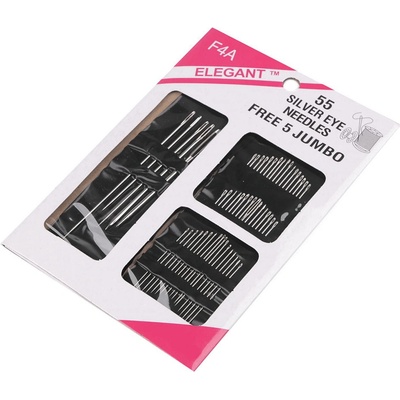 Sada univerzálních jehel na ruční šití či vyšívání. Najdete zde 55 kusů jehel různé délky, průměru a velikostí uch, kromě klasických jehel je tu jehla na pytlovinu, tupá jehla...