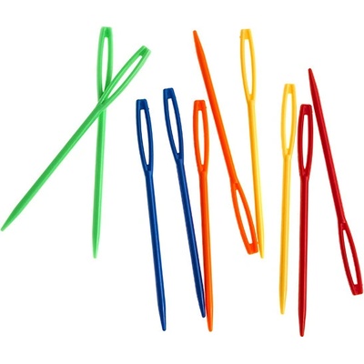 Plastové jehly s tupou špičkou a velkým očkem jsou ohebné a odolné proti zlomení. Ideální pro děti, které se učí šít.Balíček obsahuje jehly v různých, náhodných barvách.Délka: 7...