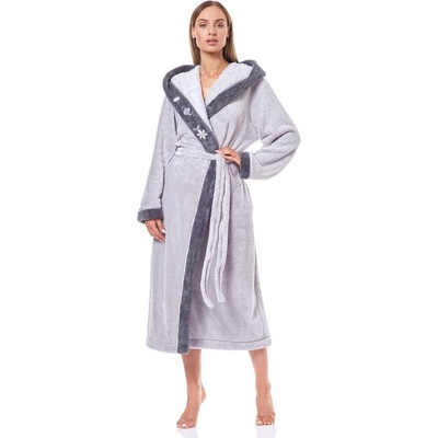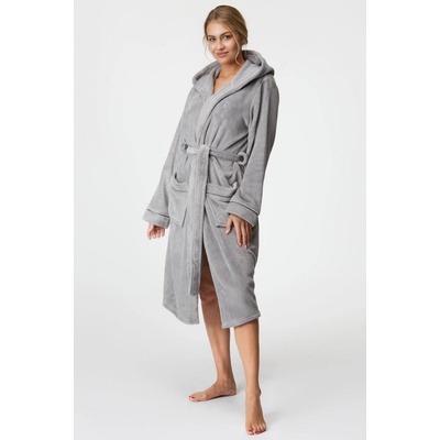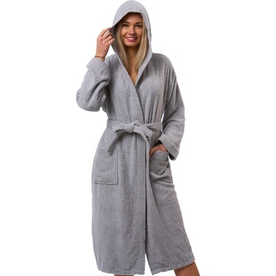 Moderní světle šedý župan ze 100% bavlněného froté. Dlouhý střih, kapuce, kapsy, pásek. Měkký a pohodlný.
