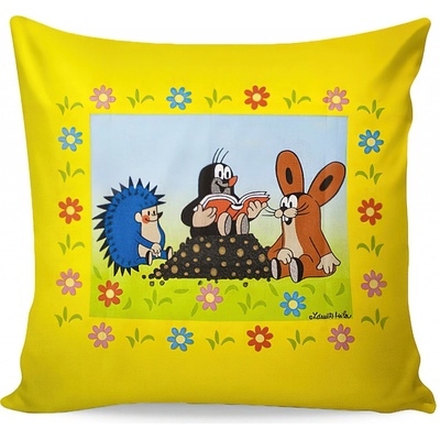 Dětský polštářek s motivem Krtečka a jeho kamarádů ježka a zajíce z klasického českého animovaného večerníčku na žlutém podkladu. Povlak je z druhé strany žlutý se vzorem Krtka...