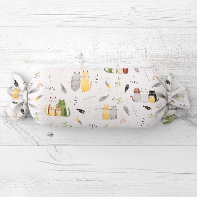 Dekorační válcový polštář „bonbon“ s milým dětským motivem koček v zelených, žlutých, šedých a hnědých barvách na bílém podkladu. Povlak je ušitý ze 100% bavlněného plátna s...