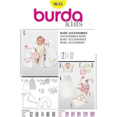 Střih Burda žlutý 9635 - spací pytel, deka, kojící polštář, bryndáčky, maňásek/usínáček, je soubor střihů pro ušití základní výbavy pro miminko. Střihy jsou natištěné na...