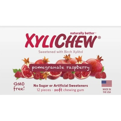Granátové jablko žvýkačky Xylichew s gumovou základnou bez plastových materiálů, bez cukru, bez aspartamu a bez ostatních umělých sladidel, bez GMO, bez lepku, veganské. Sladěné...