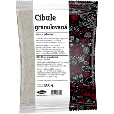 Složení: Granulovaná cibule 100% Skvělá náhrada čerstvé cibule. 1 kg granulované cibule nahradí 11 kg čerstvé cibule. Výživové údaje na 100g výrobku:energetická hodnota...