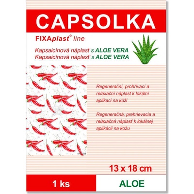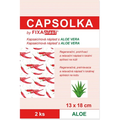 Fixaplast Capsolka kapsaicínová náplast 13x18cm 2 ks Regenerační, prohřívací a relaxační náplast k lokální aplikaci na kůži. Díky obsahu aloe Vera šetrně chrání pokožku a...
