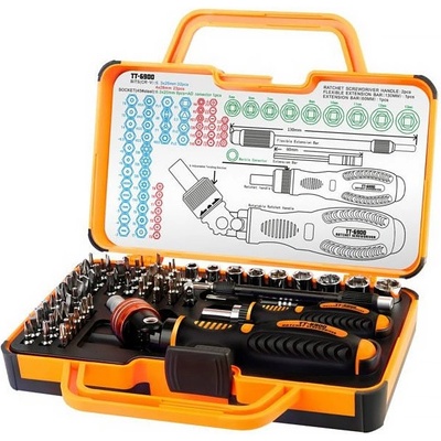 Pro precizní práci, protiskluzové rukojeti, jemně opracované bity, flexibilní prodloužení. Pevný uzamykatelný úložný box s rukojetí. - 1x ráčnový šroubovák s nastavitelnou...
